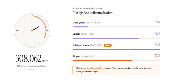 Peki o zaman nereye gidiyor? Verilerimiz ilginç bir tablo çiziyor. İçerik üretiminin %38'i öğleden sonra, yani tam da okul saatlerinde gerçekleşiyor. Aktivite yoğunluğu saat 10:00 ile 15:00 arasında zirve yapıyor. Yani öğretmenlerimiz bizi evde ders hazırlığı için değil, sınıfın tam ortasında kullanıyor. Ders arasında hızlı bir quiz, teneffüste yarınki plan, öğle arasında bir podcast taslağı.