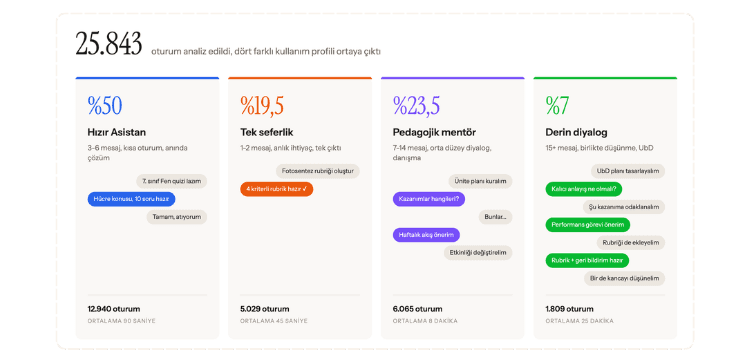 Oturumların yarısı kısa etkileşimler: 3-6 mesajlık, birkaç turda kapanan sohbetler. Öğretmen ders arasında soruyor, yanıtını alıyor, devam ediyor. Her beş oturumdan biri tek seferlik komut: tek cümleyle ne istediğini söylüyor, anında üretiliyor. Bu iki profil toplamda %70.