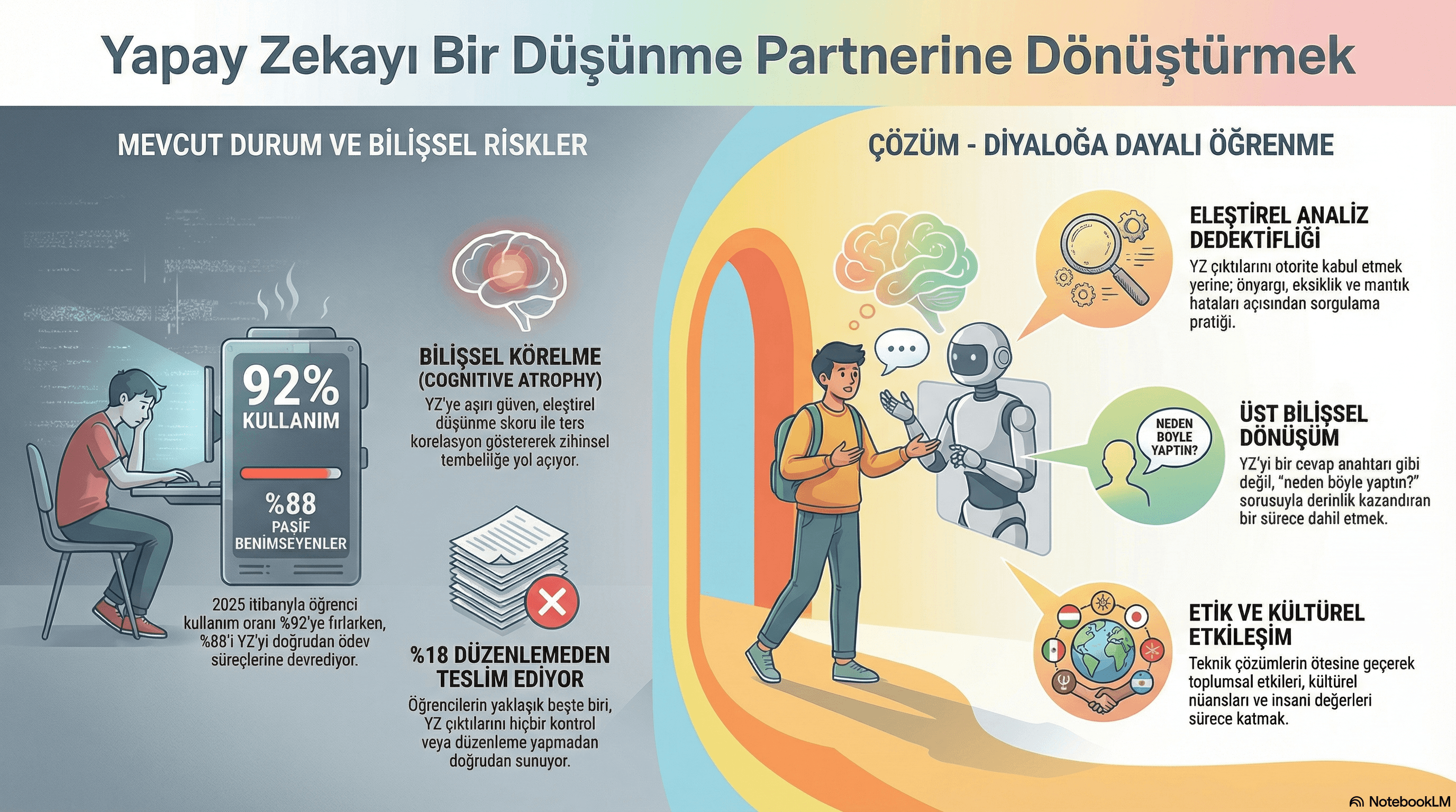 Bilişsel Körelme Riski: Yapay zekâya aşırı güvenin, eleştirel düşünme becerileriyle ters korelasyon içinde olduğunu ve süreç doğru yönetilmezse zihinsel bir tembelleşmeye yol açabileceğini vurguladık.